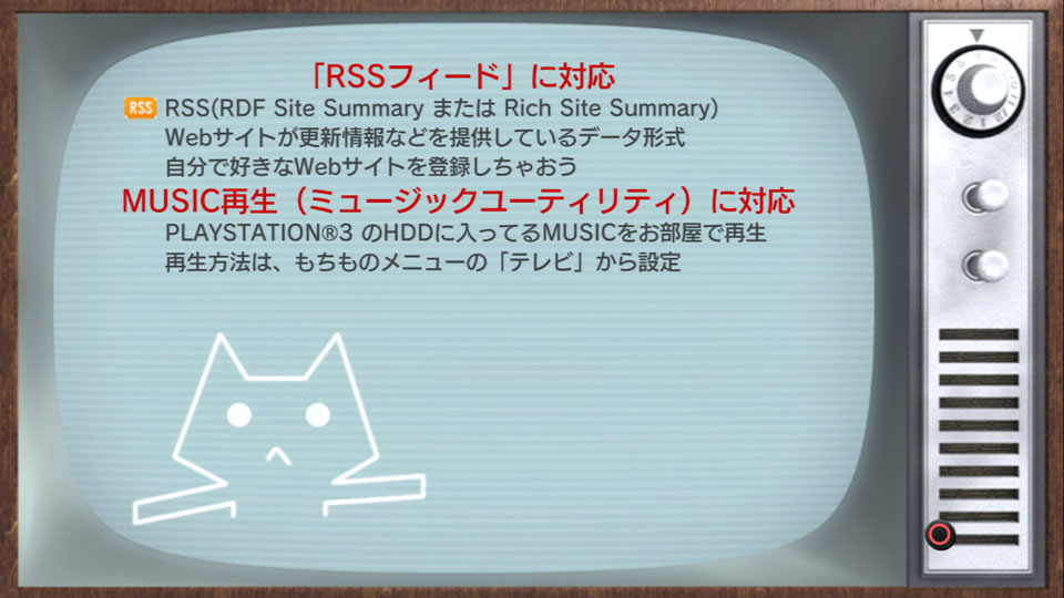注目すべきはテレビさん(980円・元カーナビさん?)の機能UP。RSSリーダ機能はPS3の基本機能に追加してほしいトコだけど、ソレは置いといて、「MUSIC再生」すよ!コレって、ファームウェア開発者インタビューで言われていた機能を初めてソフト側で使ったものになるワケよね。